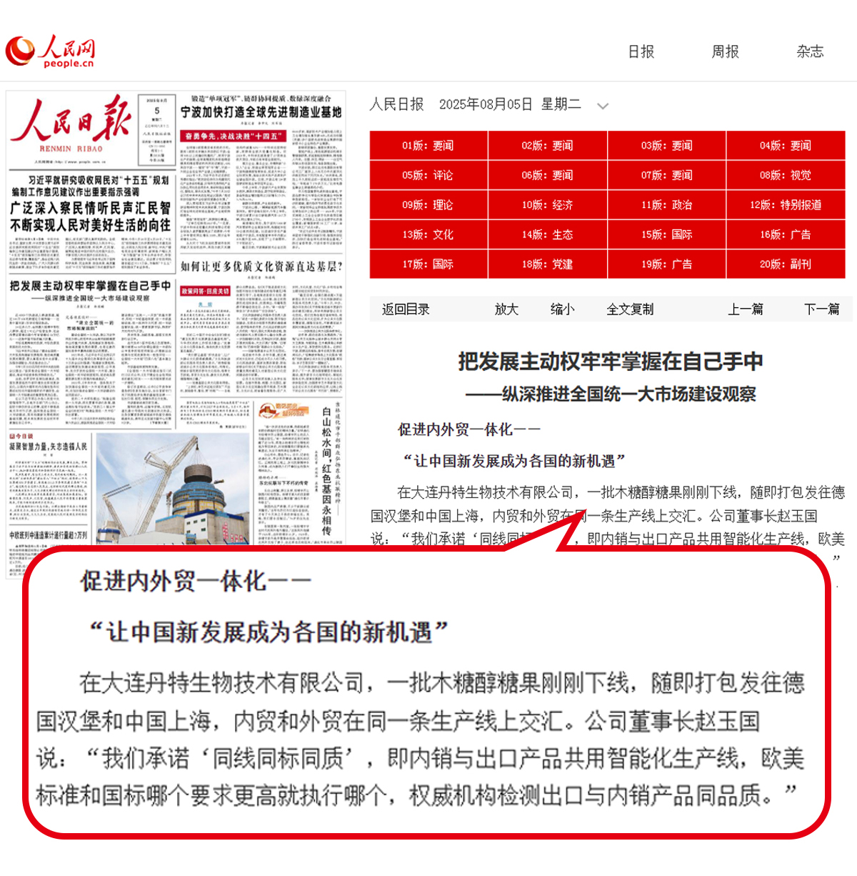 2025年8月5日,大连丹特生物技术有限公司(以下简称“丹特生物”)作为健康糖果行业标杆企业,因其在推进“同线同标同质”(以下简称“三同”)工作中的突出贡献,获《人民日报》报道。